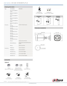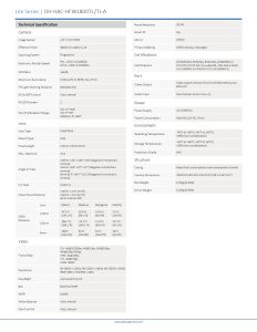 1/2.7 inch CMOS, 3840 (H)× 2160 (V), 4K, 0.03Lux/F2.0, 30IRE, 0Lux IR on Minimum Illumination, 80m(262.5ft) Fill Light Working Distance, 2 IR LED Number, Fixed-focal, F2.0 Max. Aperture, One channel, built-in mic (-A) Audio Input, 12V ±30% DC, Metal front cover+plastic main body+plastic bracketen